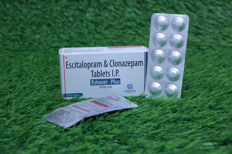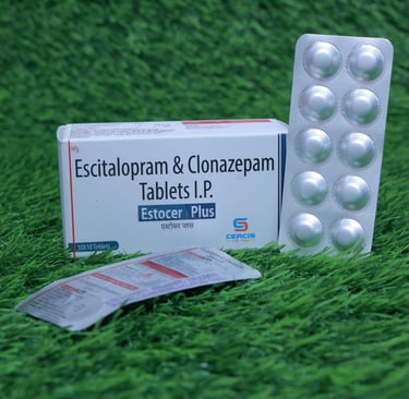 Estocer Plus is a prescription tablet combining Escitalopram and Clonazepam, used to treat anxiety disorders and depression by balancing brain chemicals and providing calming effects.