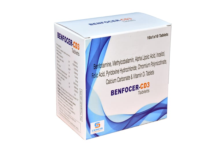 A multinutrient tablet combining alpha‑lipoic acid, benfotiamine, methylcobalamin and B‑vitamins to support nerve health, blood sugar metabolism, antioxidant defense and bone strength.